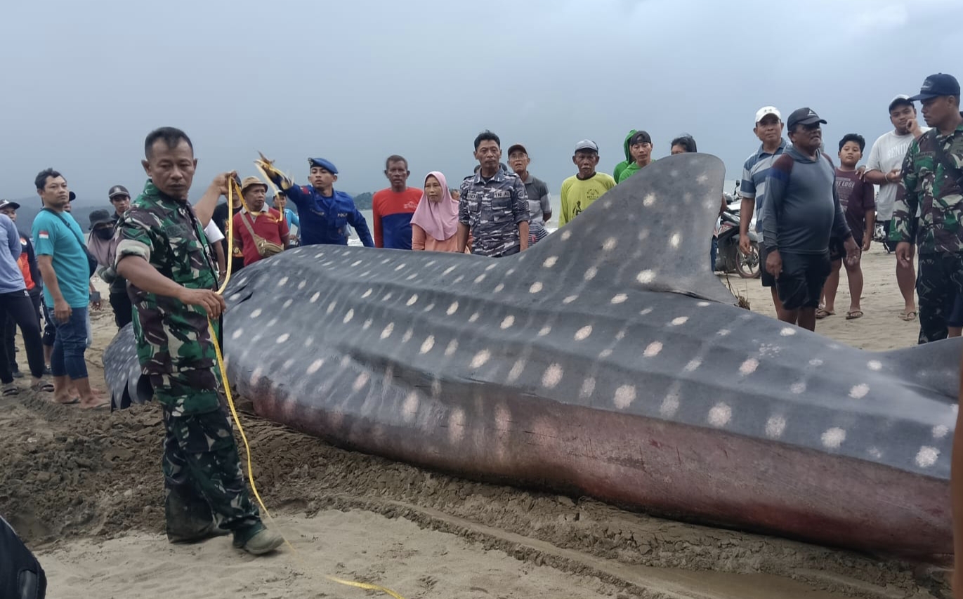 Setelah upaya penyelamatan yang melelahkan tidak berhasil, hiu paus tersebut akhirnya mati di perairan dangkal Pantai Bayem.