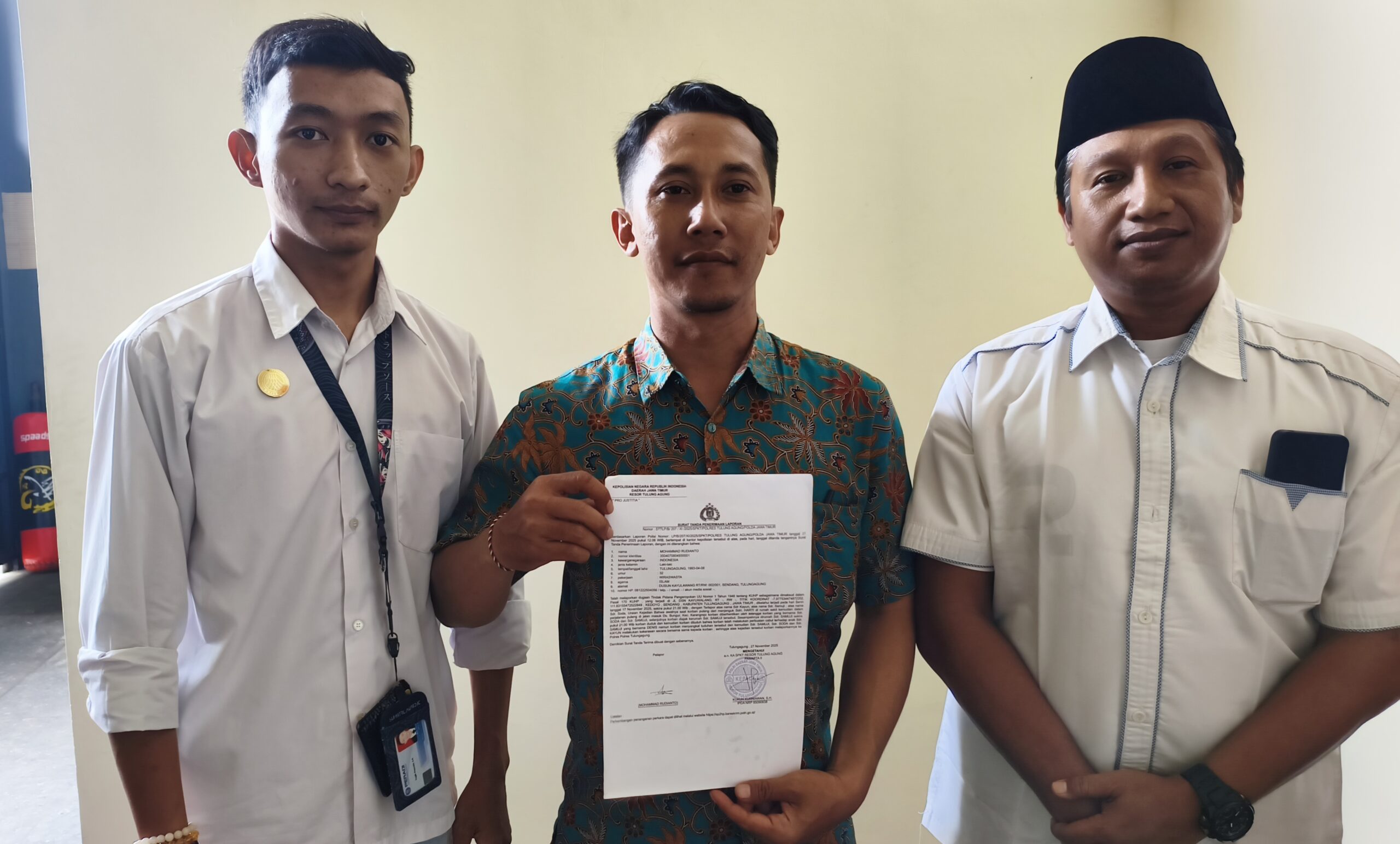 Terlapor RDT ( tengah) menunjukkan bukti Laporan didampingi kuasa hukum Sasongko SH & Partner ( anang ajttv.com)