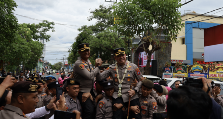 Prosesi pelepasan AKBP Muhammad Taat Resdi, yang kini mengemban amanah baru sebagai Kapolres Malang, berlangsung dengan suasana emosional. Tradisi Payung Pora mengiringi langkah perwira yang telah mengabdi selama 1,5 tahun di Tulungagung tersebut.