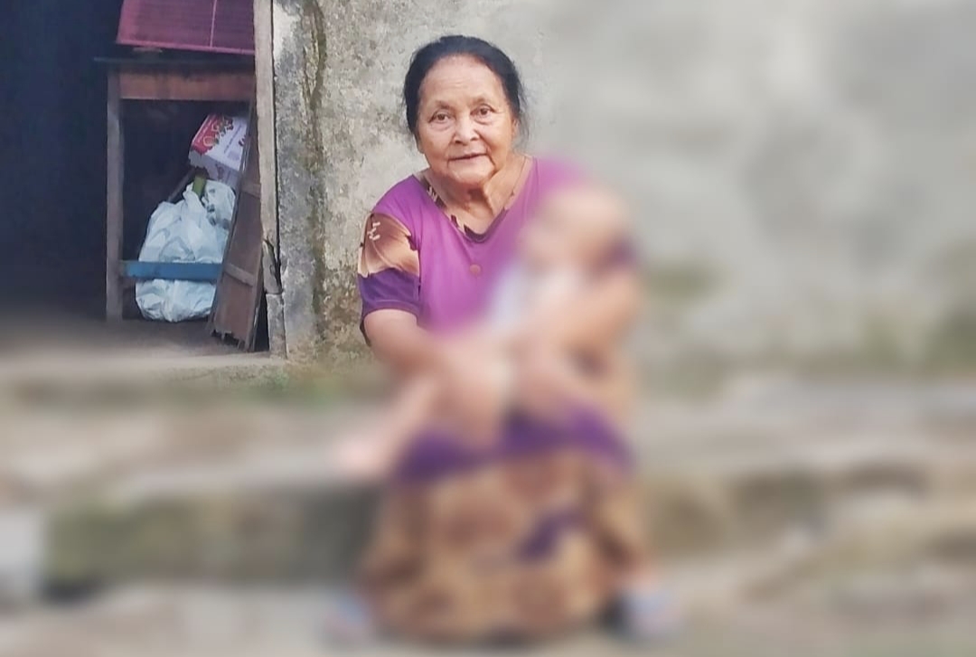 Mbah Mi Warga Tapan Kedungwaru Tulungagung saat menggendong cucu ( Sunarto Torong ajttv.com)