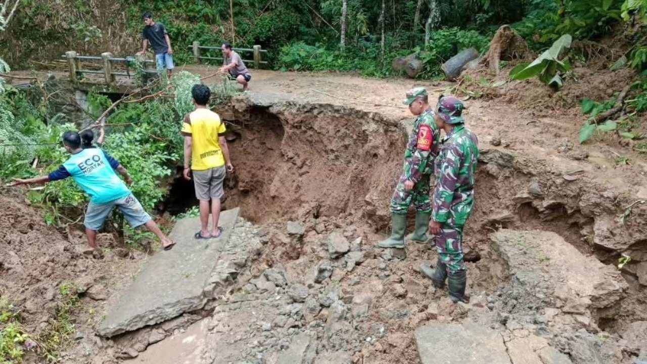 ”Hujan turun sangat deras sejak siang. Akibatnya, tebing setinggi 12 meter longsor. Selain jalan yang amblas dan terputus, sayap jembatan di dekat lokasi juga mengalami keretakan serius,” ungkap Triadi.