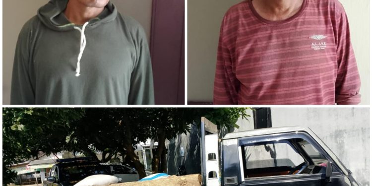 Dua orang terduga pelaku tindak pidana kehutanan tertangkap basah saat sedang mengangkut puluhan batang kayu jati hasil tebangan liar / ist